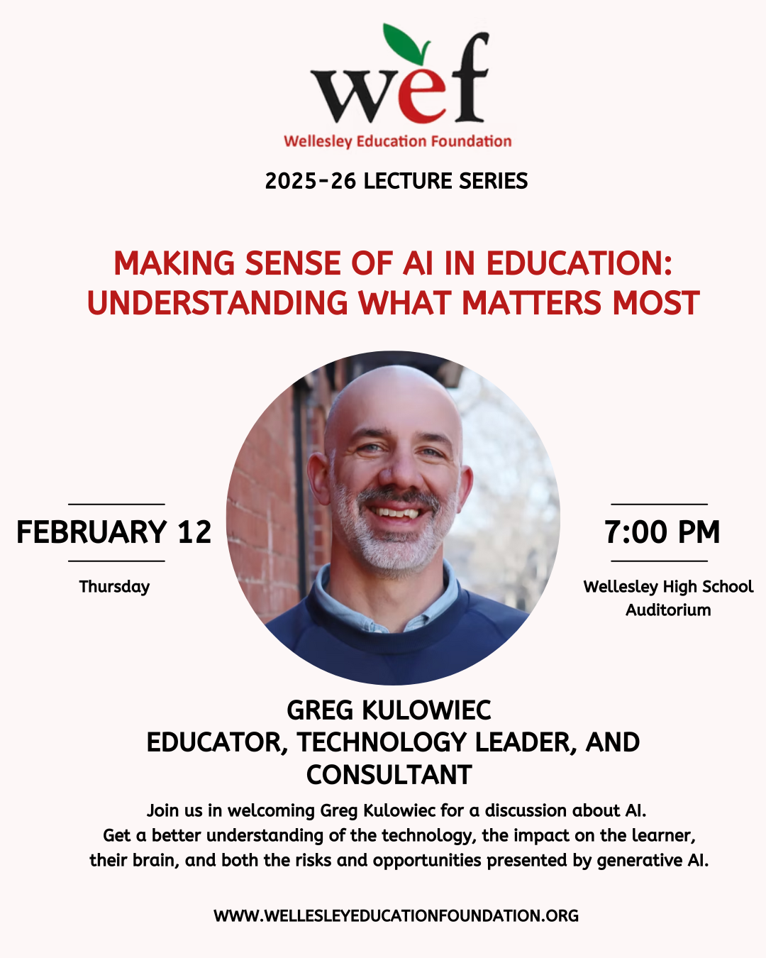 Join the Wellesley Education Foundation in welcoming Greg Kulowiec for a discussion about AI.